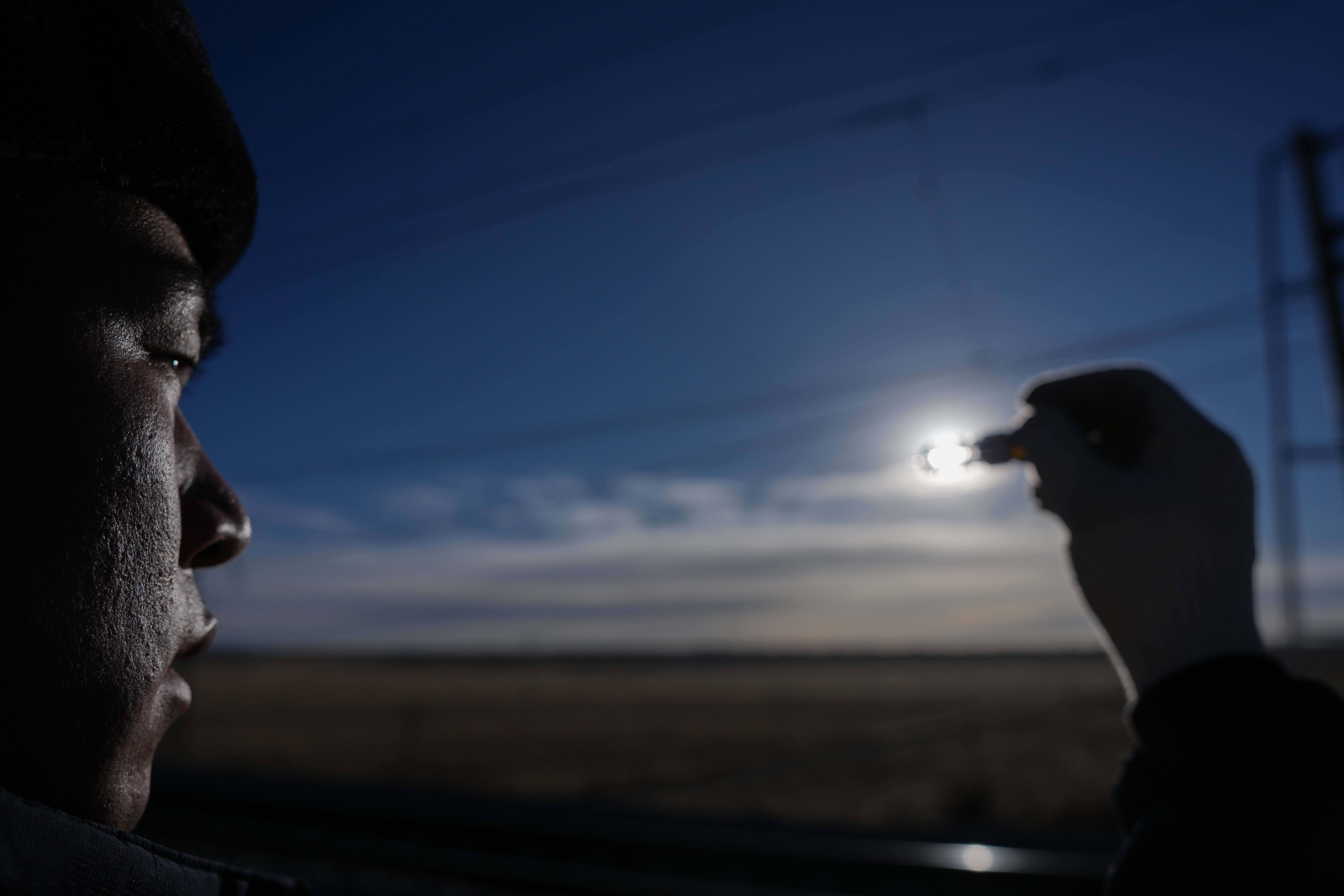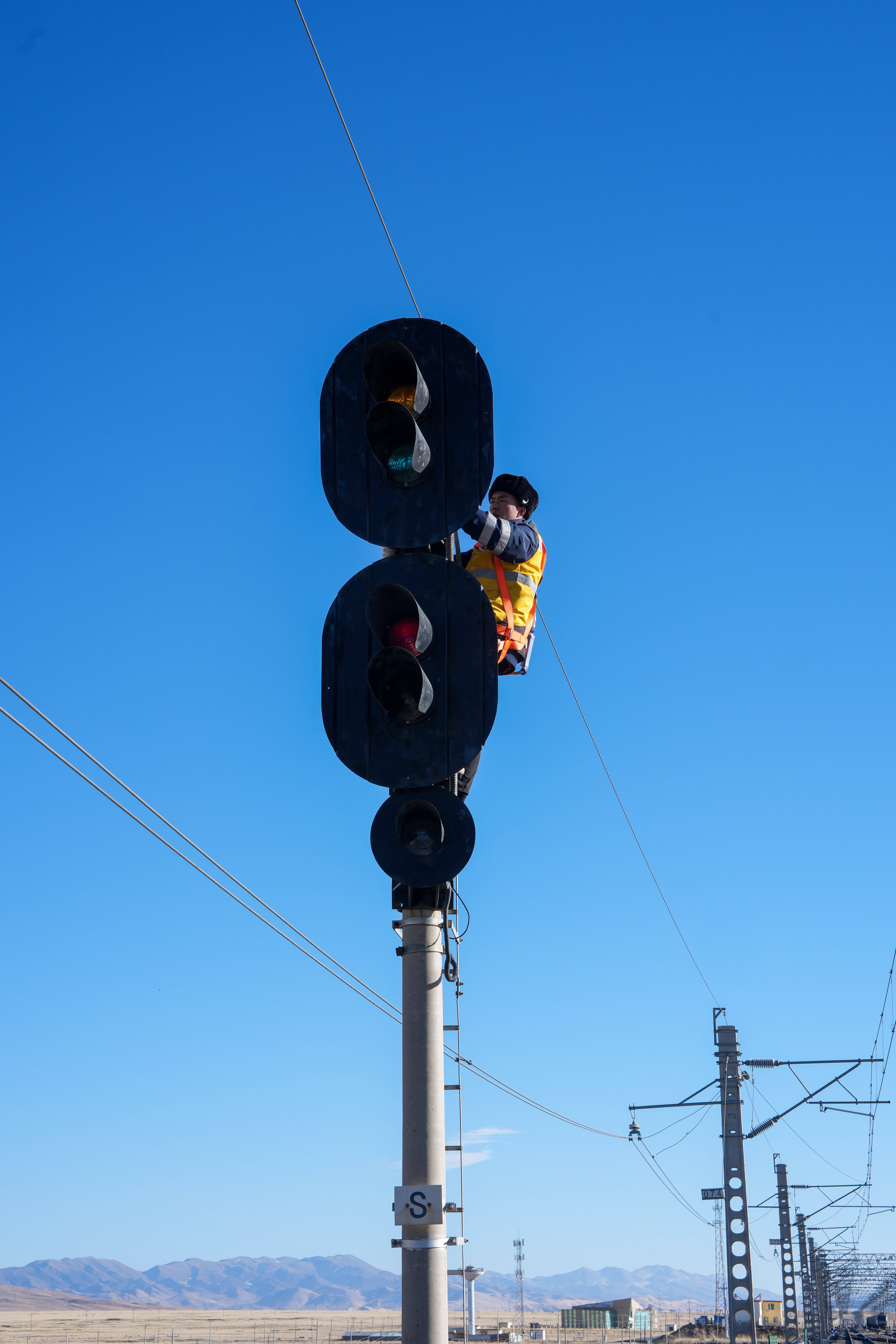 信号工孙伟在哈尔盖信号车间哈尔盖信号工区青海湖站查验信号机灯泡。沉铁谈线上的信号机是火车的“眼睛”