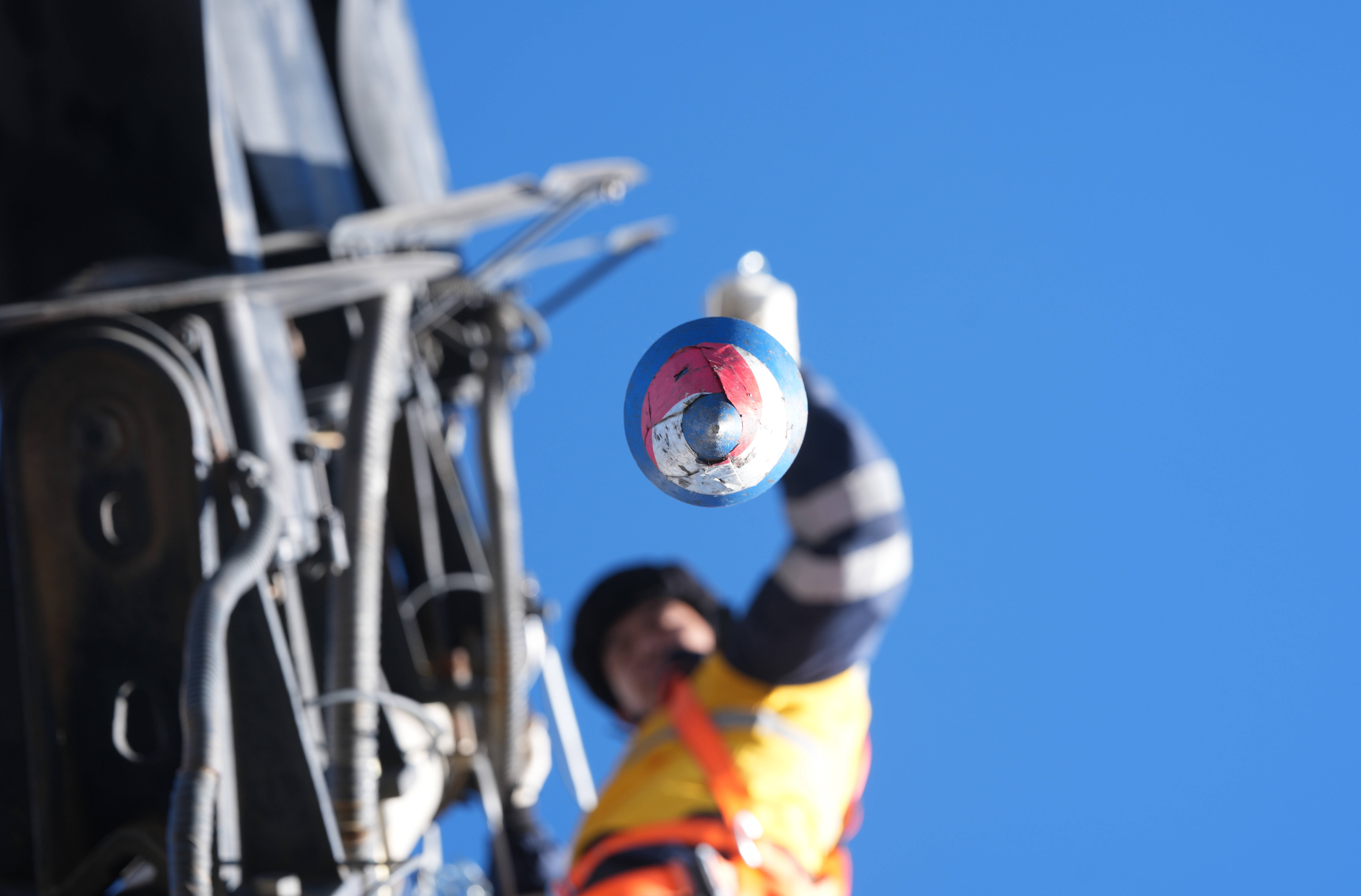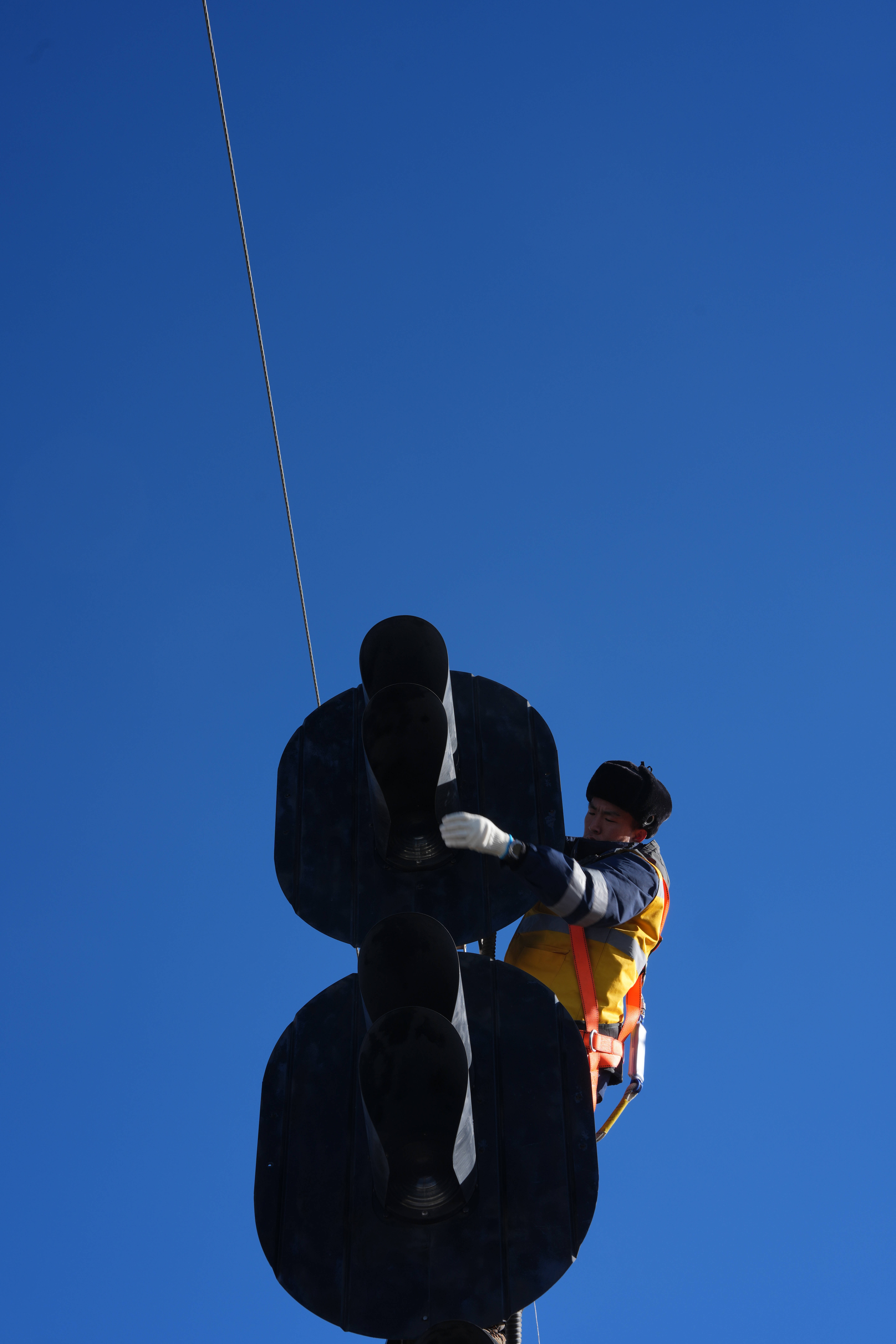 信号工孙伟在哈尔盖信号车间哈尔盖信号工区青海湖站测量信号机的限界。擦抹信号机外透镜 查验螺丝