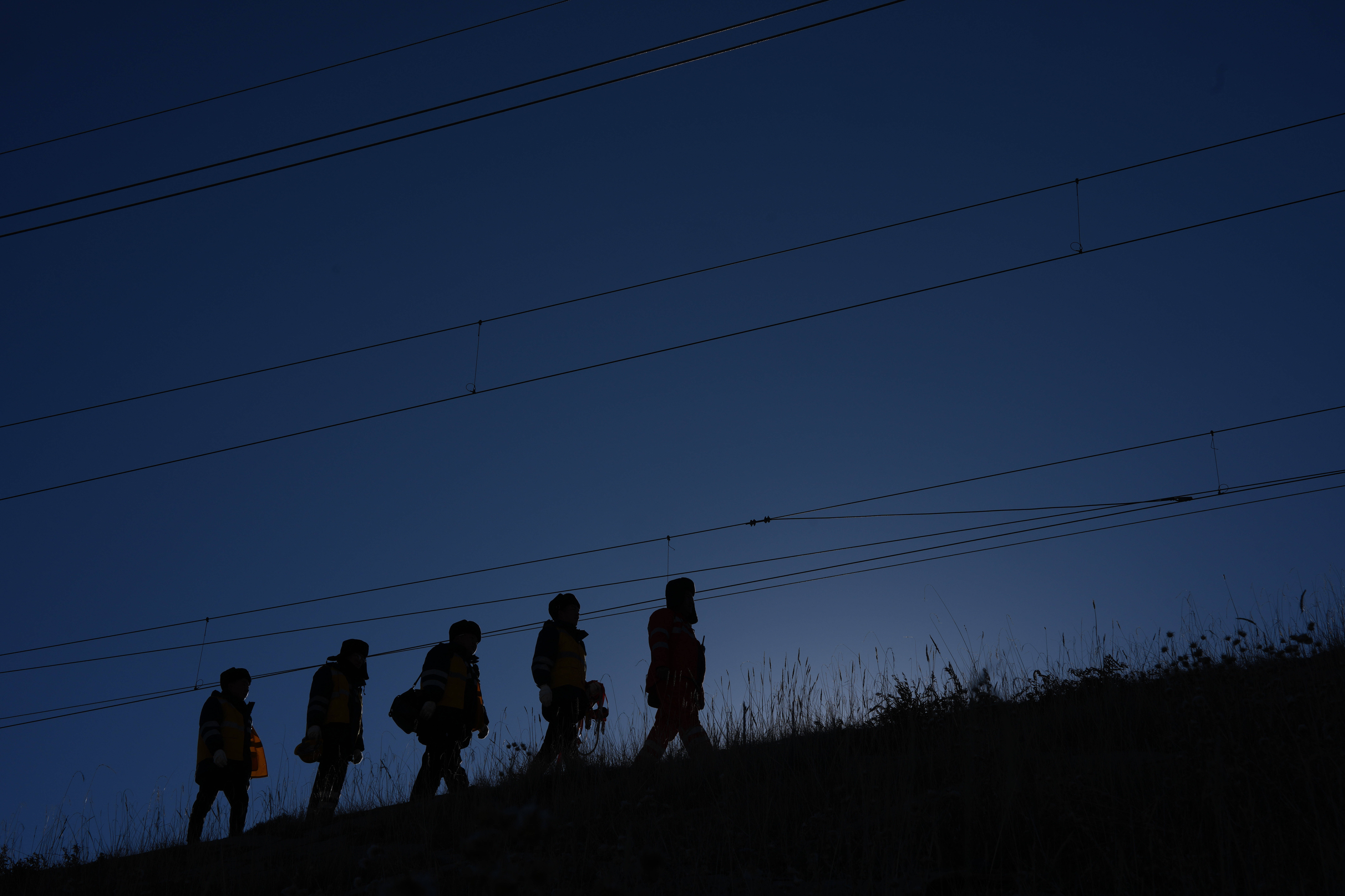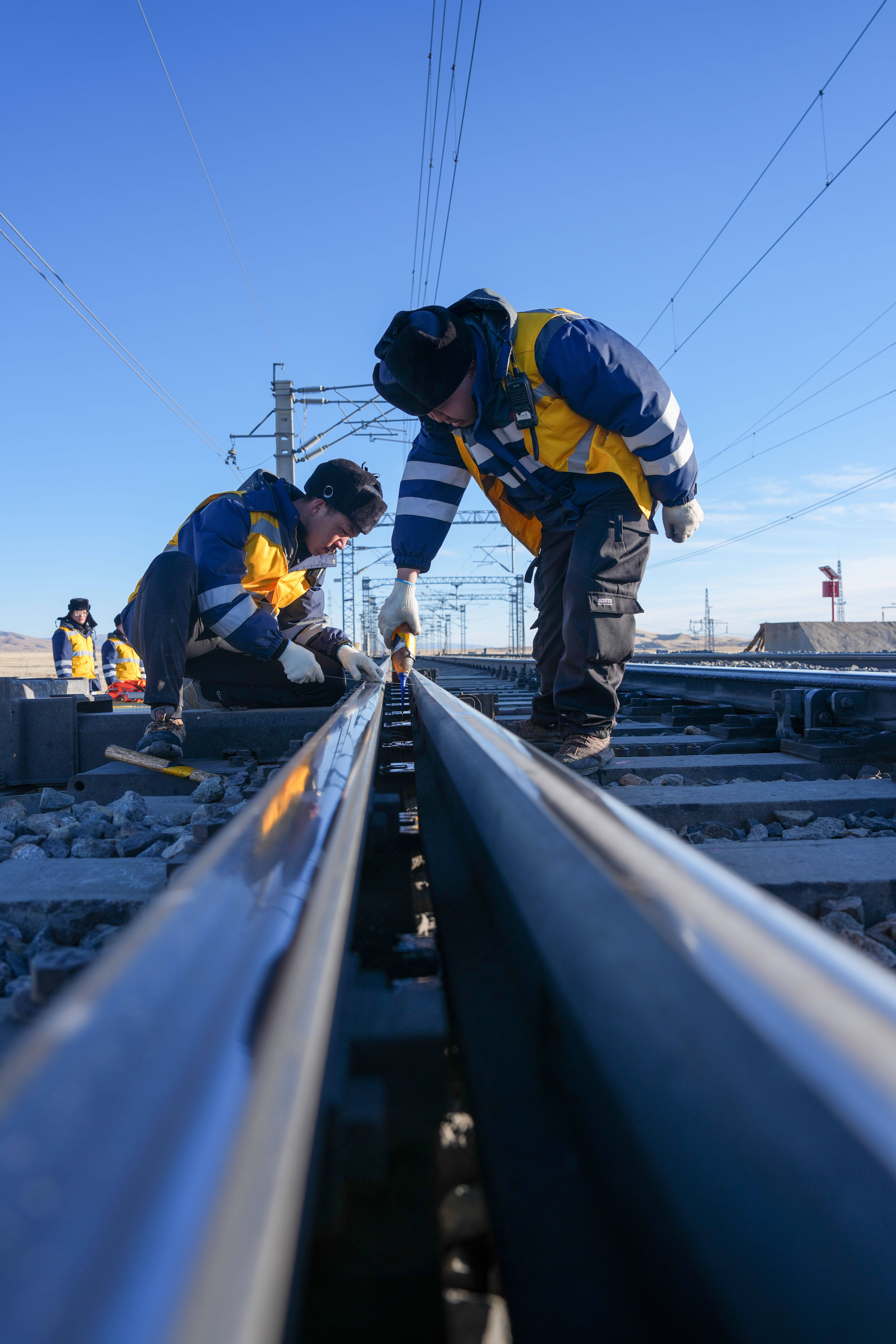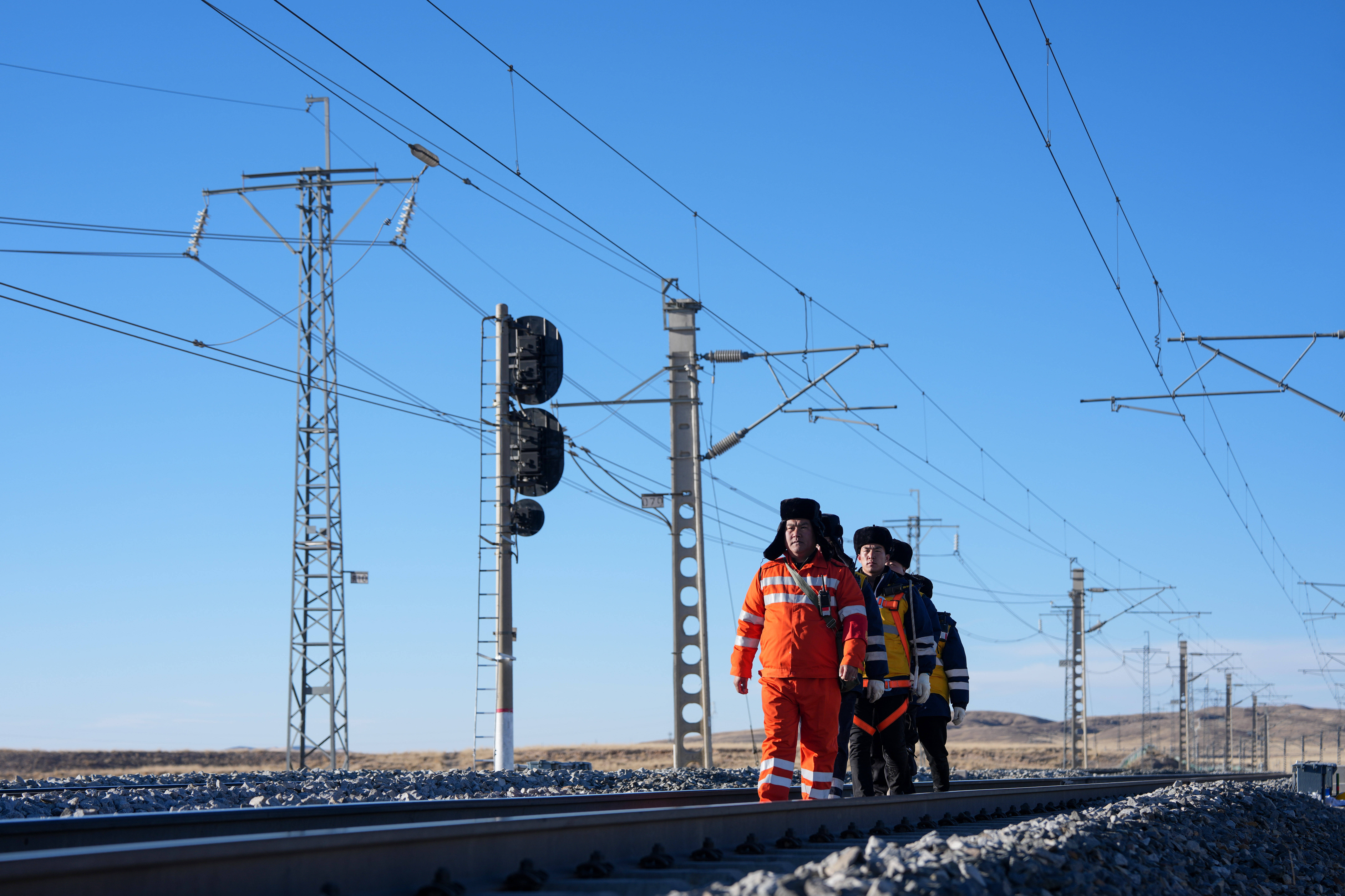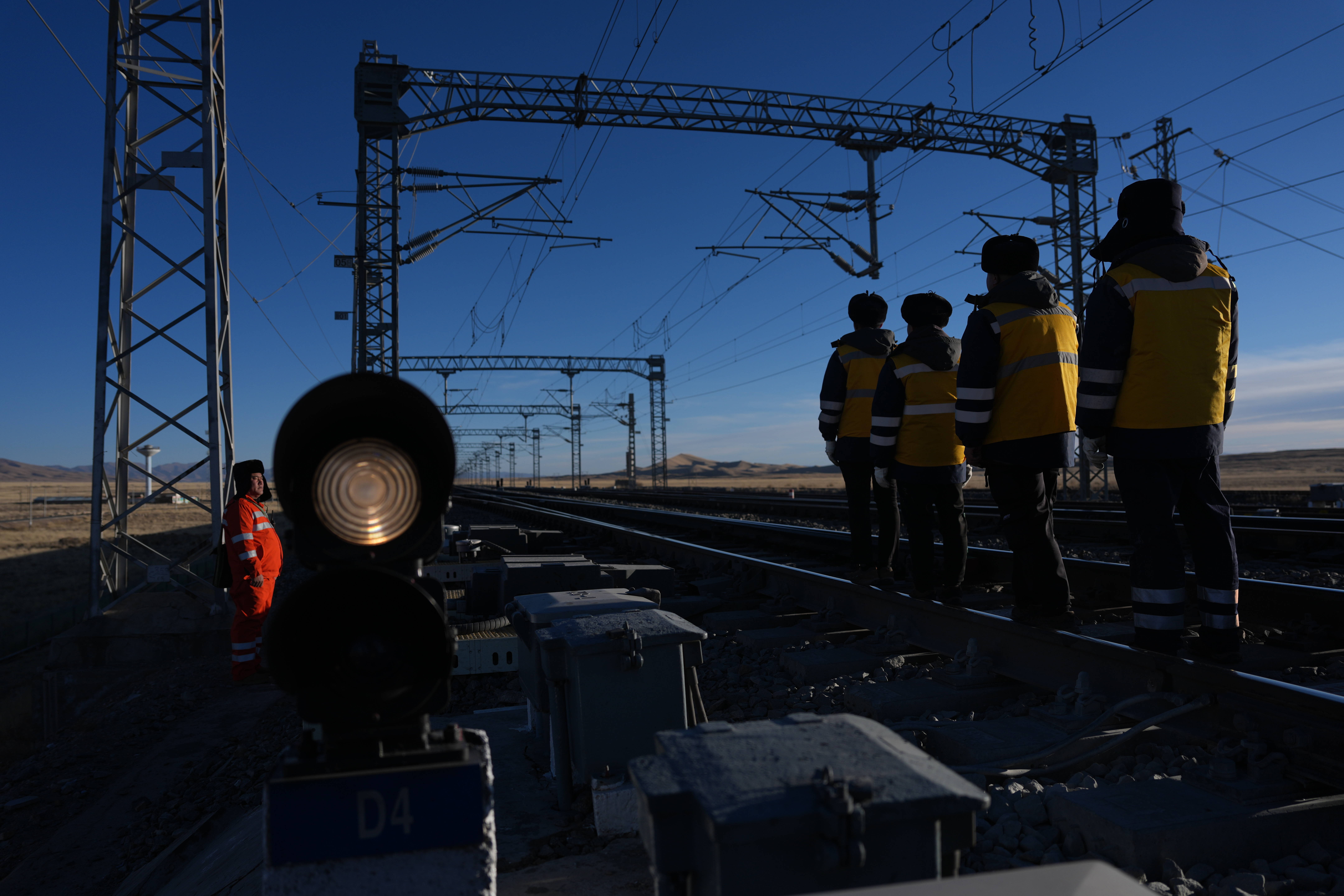 信号工们在哈尔盖信号车间哈尔盖信号工区青海湖站铁轨隔邻巡检。透镜擦抹、参数测量、泄露距离调遣