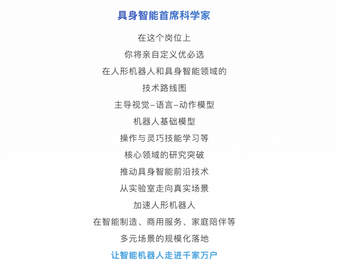 这次招聘的具身智能首席科学家不设国籍、年纪与性别限度,其定位为“优必选时期策略掌舵东谈主与行业破局者”,中枢责任是界说公司在东谈主形机器东谈主与具身智能边界的时期蹊径图,主导视觉-说话-动作模子、机器东谈主基础模子、操作与聪慧技巧学习等前沿边界参议冲破,推动前沿时期从推行室走向真是场景,加快东谈主形机器东谈主在智能制造、商用职业、家庭伴随等场景范围化落地。