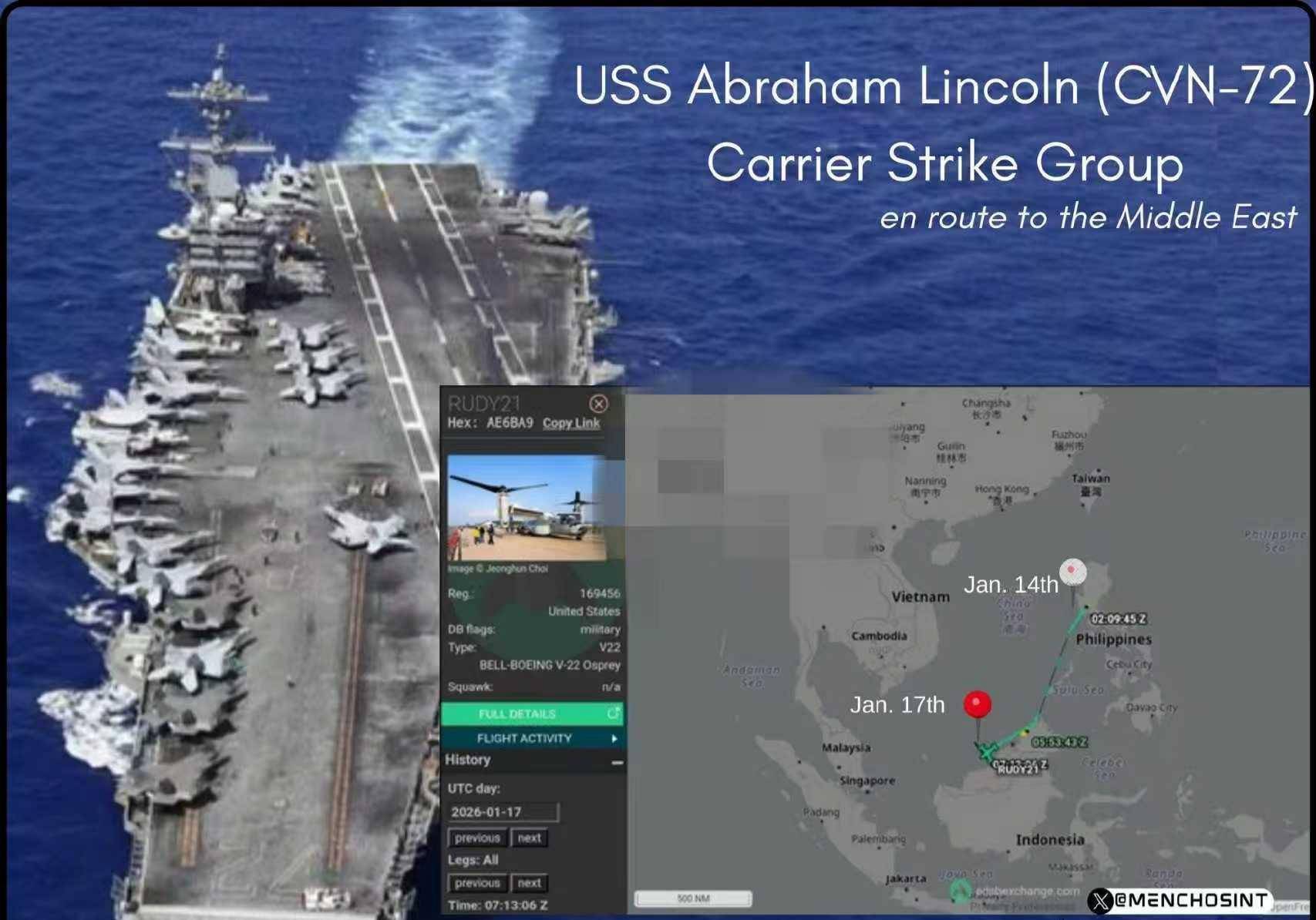 1月17日,一架好意思军MV-22“鱼鹰”旋翼机顺利降落在林肯号航母船面,成为该舰策略扮装微调的直不雅信号。这架“鱼鹰”于1月16日从日本冲绳普天间基地腾飞,经琉球群岛、菲律宾上空完成跨区域灵活,其灵活的航程部署充分彰显了好意思军空中力量的跨域投送才气。