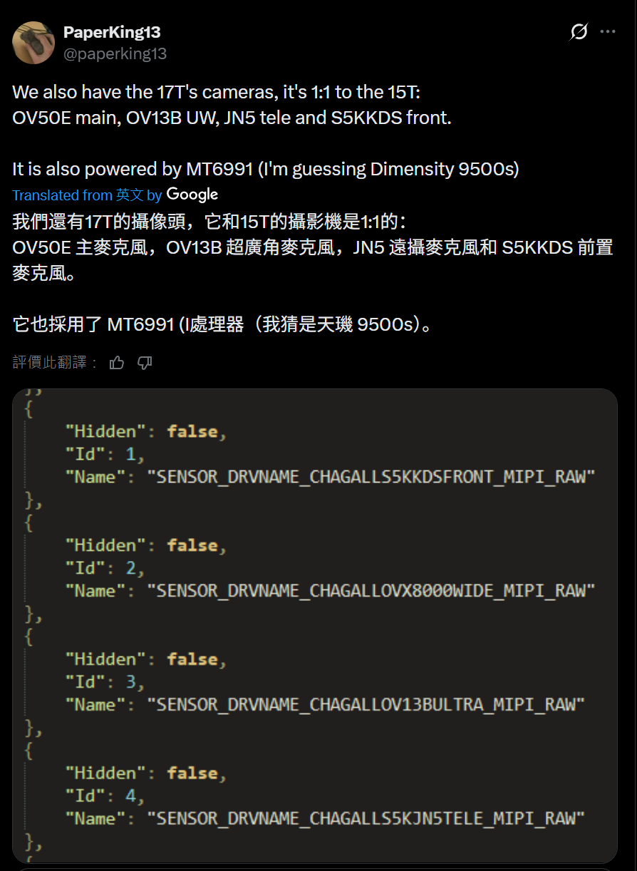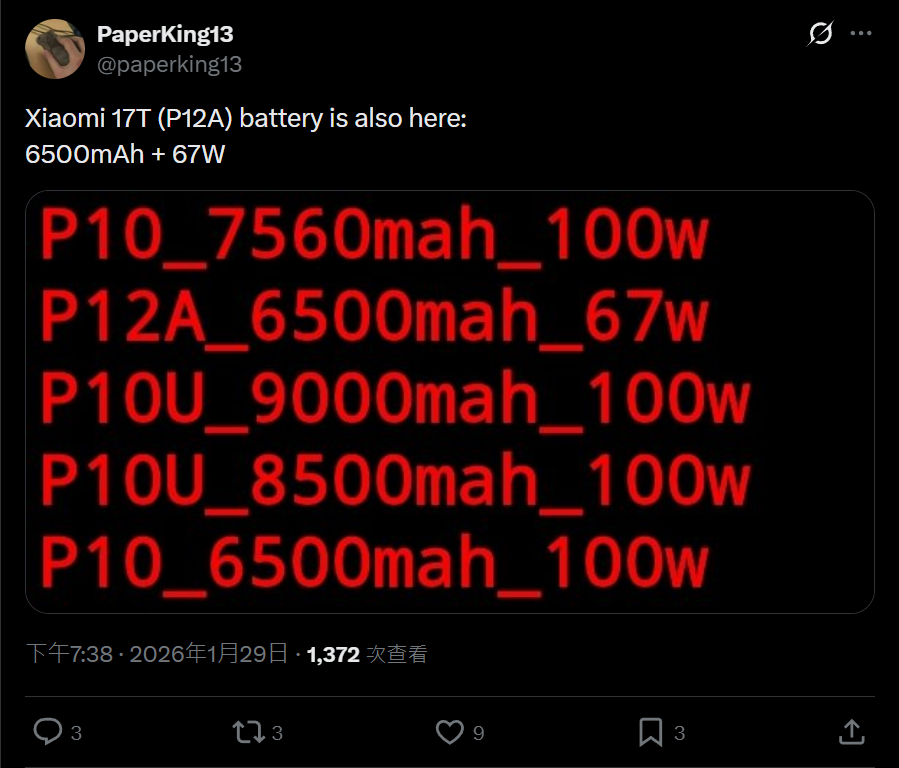 IT之家 1 月 30 日音书,据科技媒体 NoteBook Check 昨天报谈,小米主打众人市集的 17T 手机现已曝光,新机将搭载联发科天玑 9500s 芯片和 6500mAh 电板,不外相机方面预测不会有擢升。