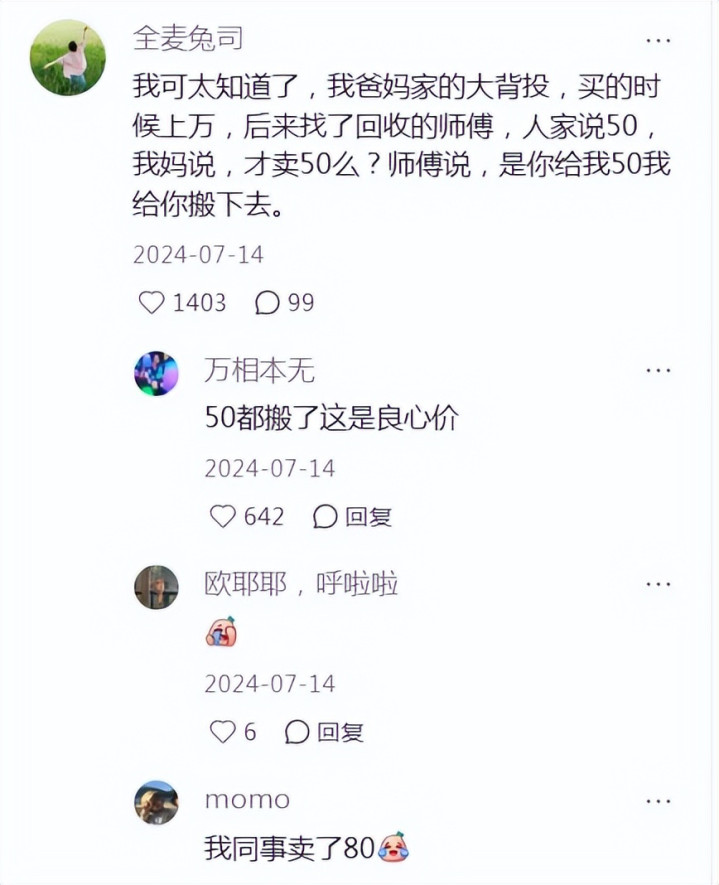网友@全麦兔司:我可太知说念了,我爸妈家的大背投,买的时间上万,自后找了回收的师父,东说念主家说50,我妈说,才卖50么?师父说,是你给我50我给你搬下去。