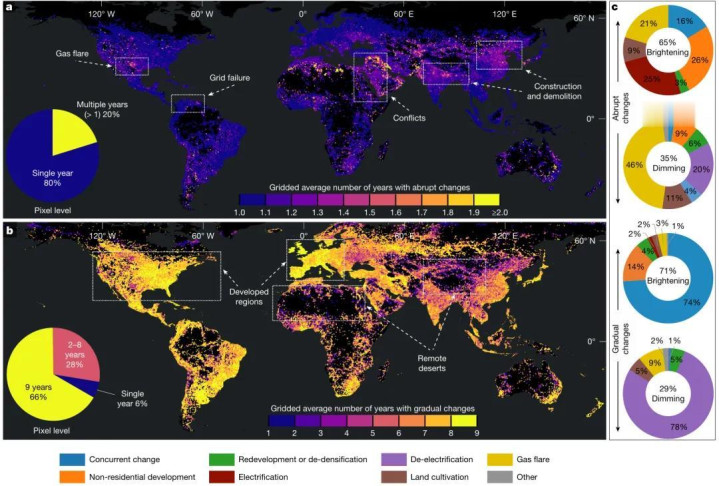 从大家总量来看,2014年至2022年间,增亮部分使大家夜间光放射量栽植了34%,但变暗则同步对消了其中18%,最终净增长约为16%。每个经验变化的地点,平均在9年里发生了多达6.6次不同标的的变化。