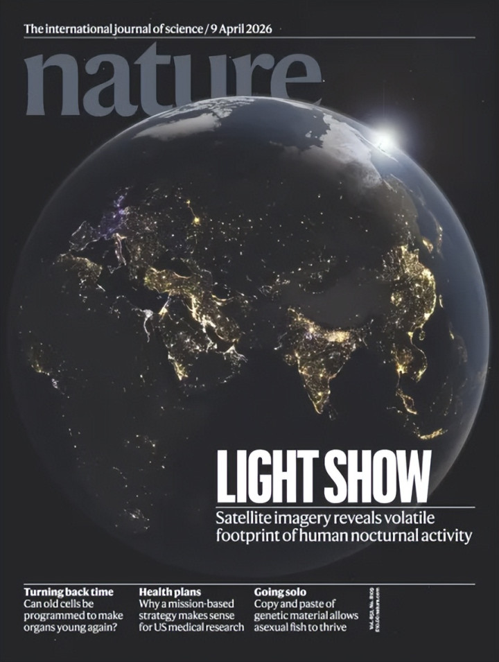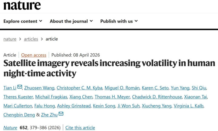 2026年4月8日,康涅狄格大学朱浙课题组齐集NASA科学家在《当然》杂志以封面状貌发表重磅参谋,初度以逐日卫星影像为基础,系统绘图出2014年至2022年间大家夜间东谈主造光的动态变化图谱。