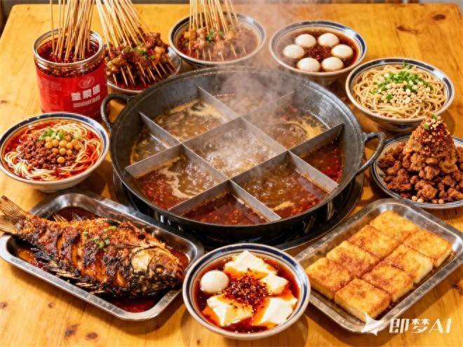 九宫格暖锅、串串香、豌杂面、担担面、万州烤鱼、笙歌山辣子鸡、小汤圆、豆花、熨斗糕......
